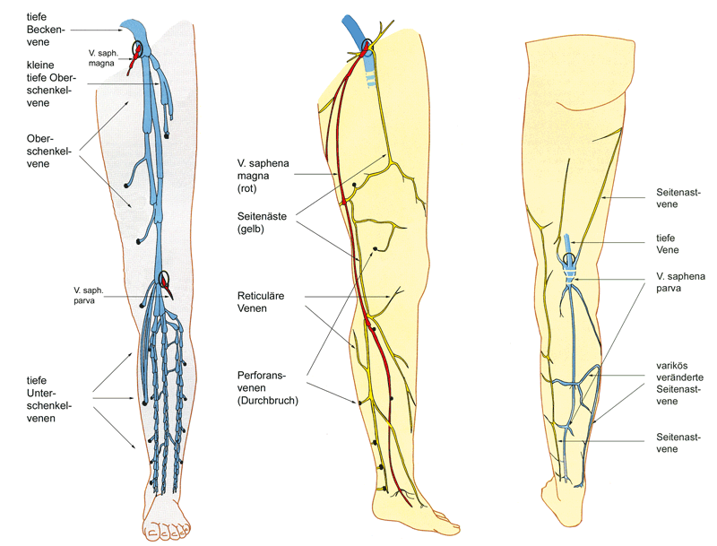 Anatomisch gesehen handelt es sich dabei – neben Venenwanddefekten – fast immer um eine Erweiterung bzw. Aussackung der oberflächlichen Venen, die dazu führt, dass sich die als Rückschlagventil fungierenden Venenklappen nicht mehr richtig schließen und es in der Folge zu einem umgekehrten Blutfluss kommt. Dadurch staut sich das Blut in den Beinen und wird nicht mehr richtig – wie im gesunden Fall – zum Herzen zurücktransportiert. Ein sich selbst verstärkender Teufelskreislauf entsteht, weil dieser fehlerhafte Blutfluss zur Erweiterung zusätzlicher Venen und einem Fortschreiten der Erkrankung führt. Die oft auffälligen und unschönen Krampfadern sind dabei nur der sichtbare Ausdruck der eigentlich zugrunde liegenden Fehlfunktion.